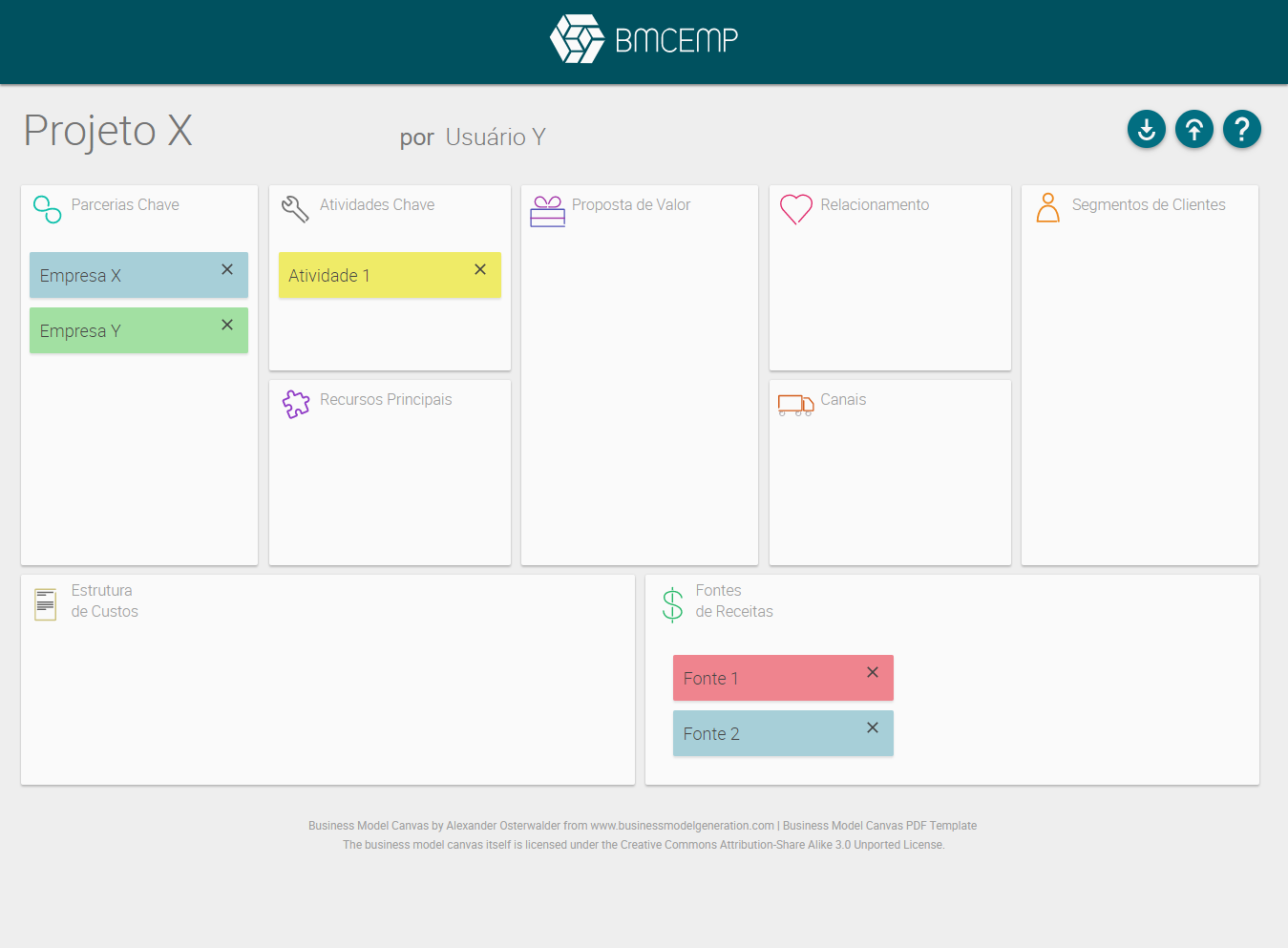 Projeto desenvolvido na cadeira de Projeto Integrado 1. É uma aplicação Web que simula a criação de um Bussiness Model Canvas(BMC), e tem como cliente o CEMP(Centro de Empreendedorismo da UFC). Foi usado como para ser feito HTML/CSS para o visual, e JavaScript com o uso das bibliotecas jQuery e jQuery UI para criar toda a interação. Trabalhei na parte de concepção do projeto e de toda a programação da aplicação.